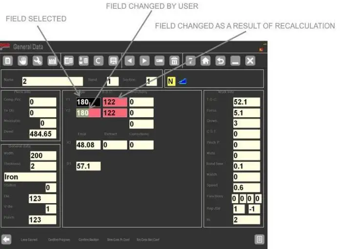 Ein wichtiger Punkt sollte klar verstanden werden: die im General Data Mask gezeigte Biegung ist eine temporäre Kopie, Nicht die aktive Produktionsbiegung selbst. Dies ermöglicht dem ESA S875 Press Brake einen sichereren Korrektur-Workflow. Operatoren können mögliche Änderungen inspizieren, bevor sie sie auf das eigentliche Programm anwenden.