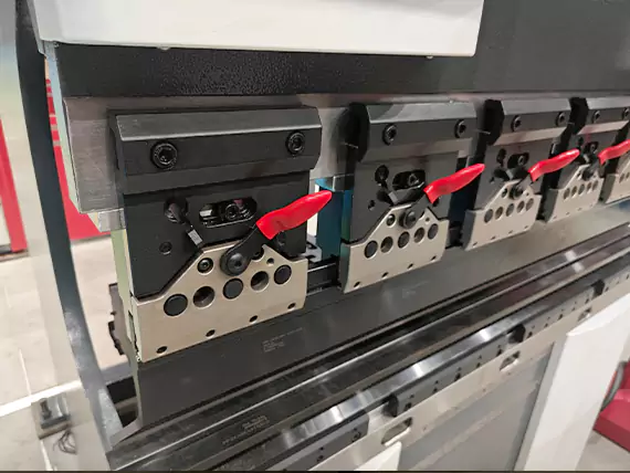 Obere Abkantstempel können schnell ein- oder ausgebaut werden, sicher, und das ohne Werkzeug dank Amada-Schnellspannern. Der Bediener kann die Ausrüstung in Sekundenschnelle mit einem einfachen Hebel oder einem Nockenverriegelungsmechanismus sichern oder freigeben, Erhebliche Verkürzung der Rüstzeit und Steigerung der Produktionsproduktivität.